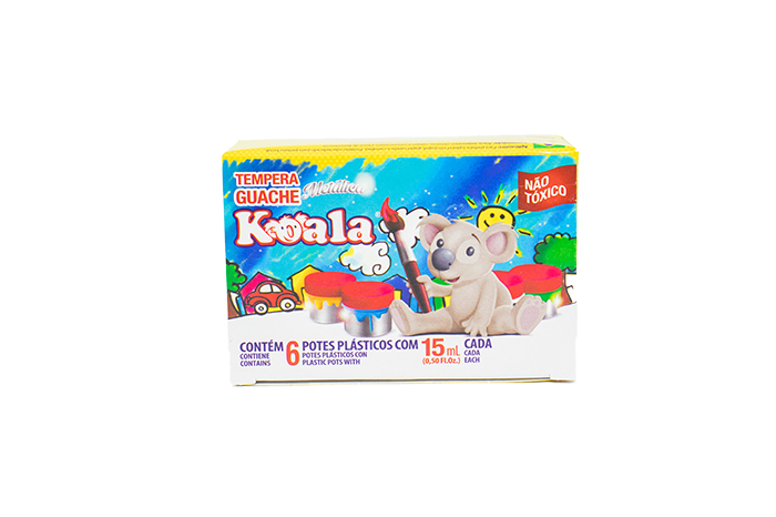 A tinta guache metálica 06 cores 15ml Koala possui brilho diferenciado e cores miscíveis entre si, ótima cobertura com aspecto metálico que dá um efeito especial no momento da atividade artística e da brincadeira. Ideal para o desenvolvimento da percepção visual e criatividade das crianças. Com aroma agradável, pode ser utilizada com o auxílio de pincéis e esponjas.